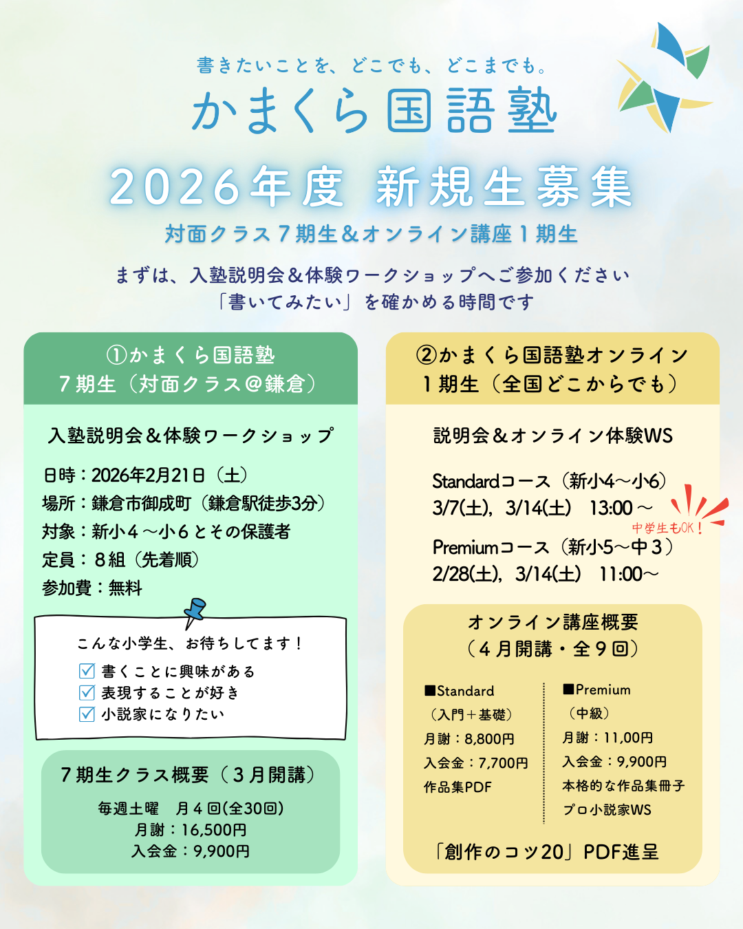 かまくら国語塾では、2026年度も新規生の募集を行います。